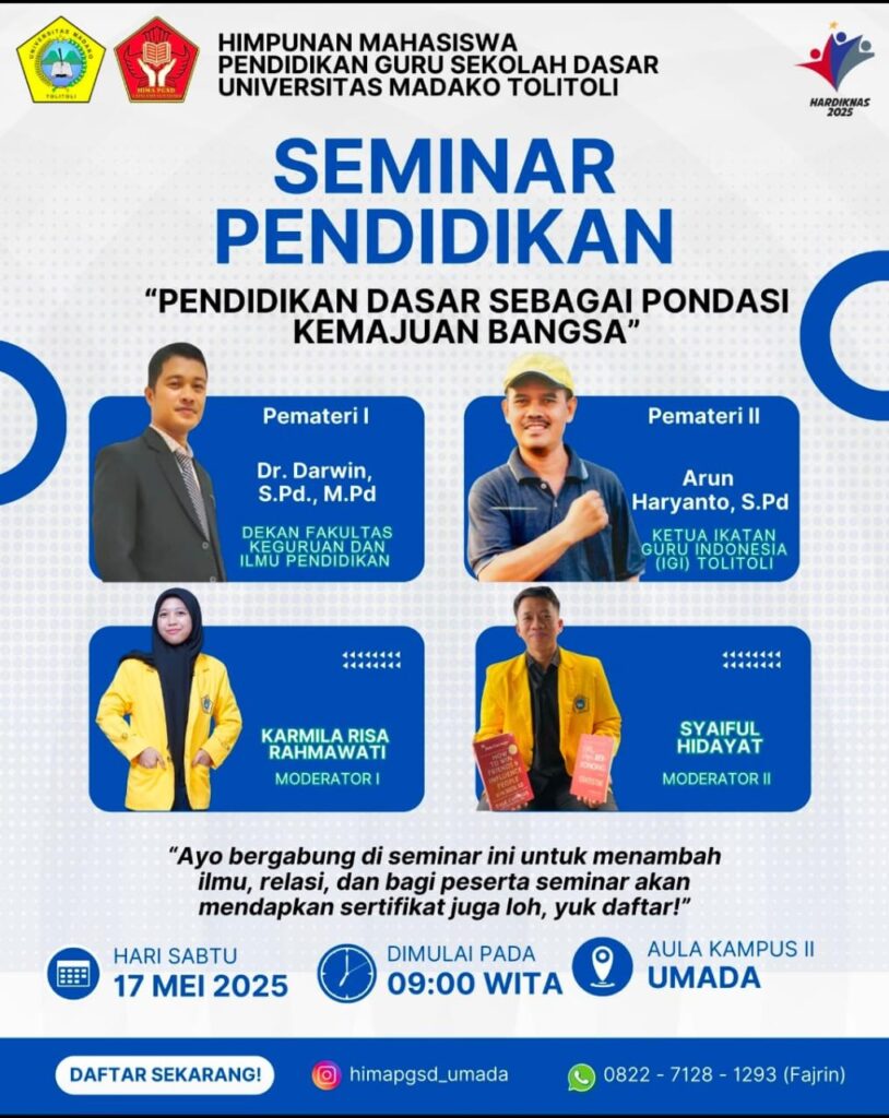Dalam rangka memperingati Hari Pendidikan Nasional, Himpunan Mahasiswa Program Studi Pendidikan Guru Sekolah Dasar (HIMA PGSD) menggelar kegiatan sosialisasi pendidikan bertajuk “Pendidikan Dasar sebagai Pondasi Kemajuan Bangsa”. Acara ini diselenggarakan di aula kampus II UMADA dengan melibatkan mahasiswa PGSD. Kegiatan ini bertujuan untuk meningkatkan kesadaran akan pentingnya pendidikan dasar sebagai fondasi utama dalam membentuk karakter dan kemampuan generasi penerus bangsa.